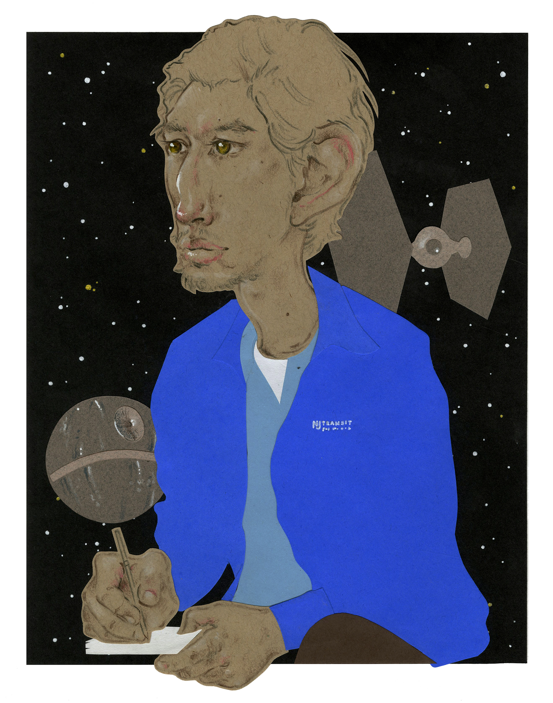 A caricature of the actor, Adam Driver. I put him in his costume from "Paterson" against a "Star Wars" background.